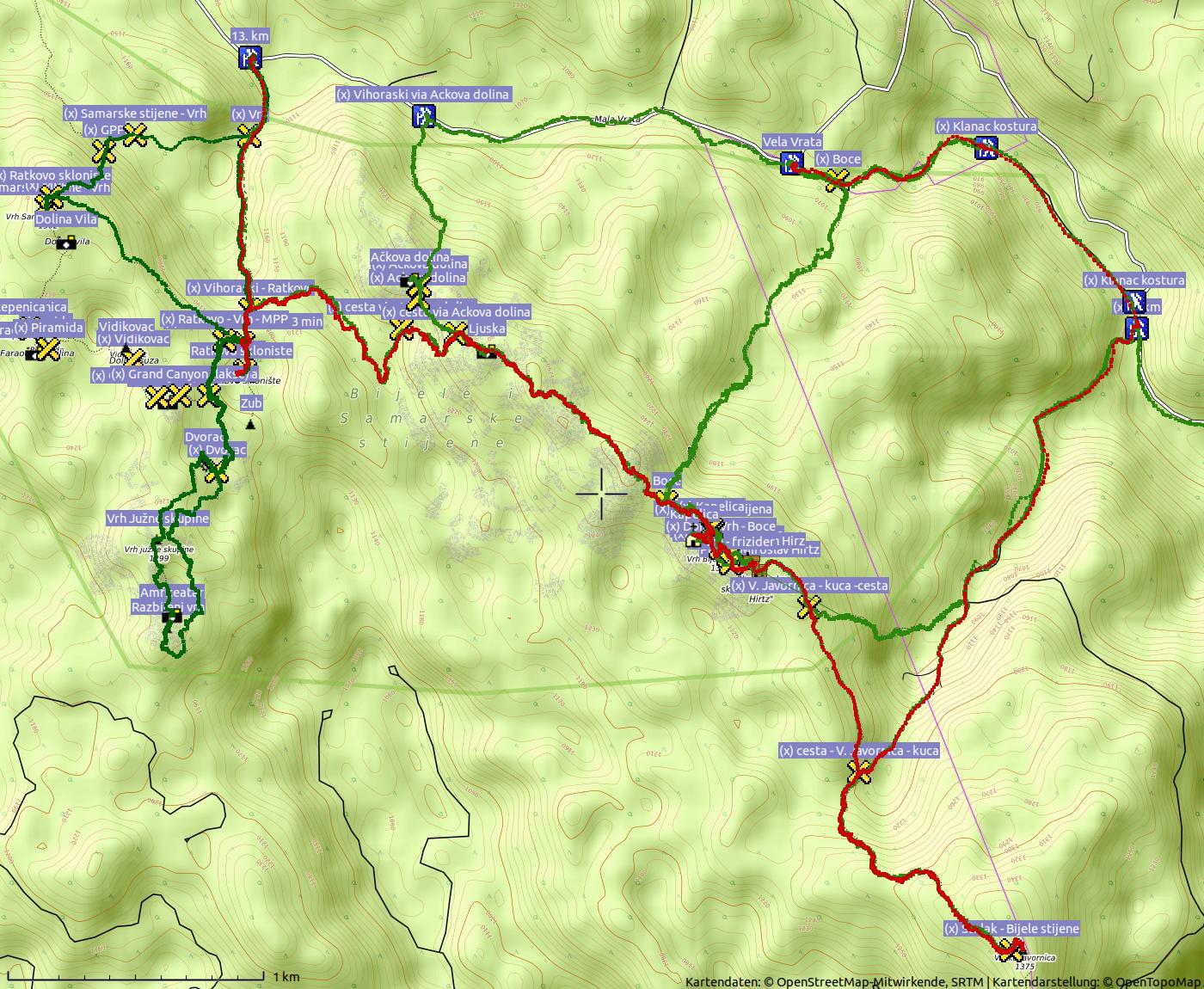 1. dan 13. km -> Ratkovo sklonište -> Ljuska -> Boce -> Kapelica -> Vrh Bijelih stijena -> Pl. kuća Dragutin Hirz