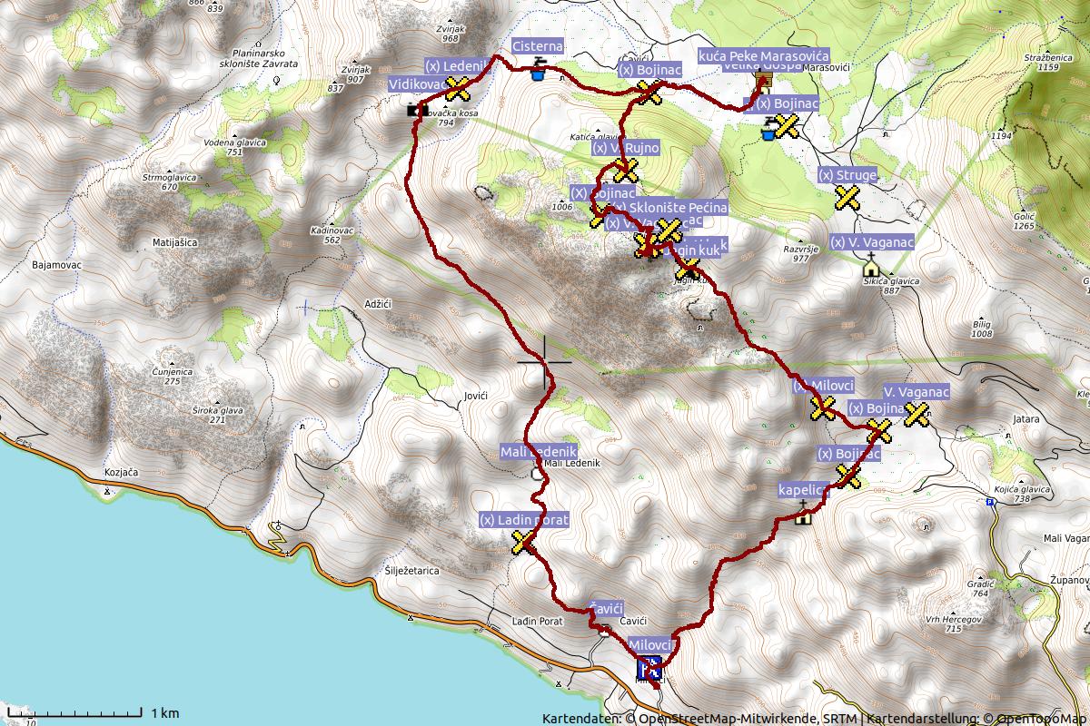 - Duljina: 5:30 h (u kretanju) / 10 km; Uspona: 1250 m; Spusta: 450 m; Raspon nadmorskih visina: 80 - 1110 m